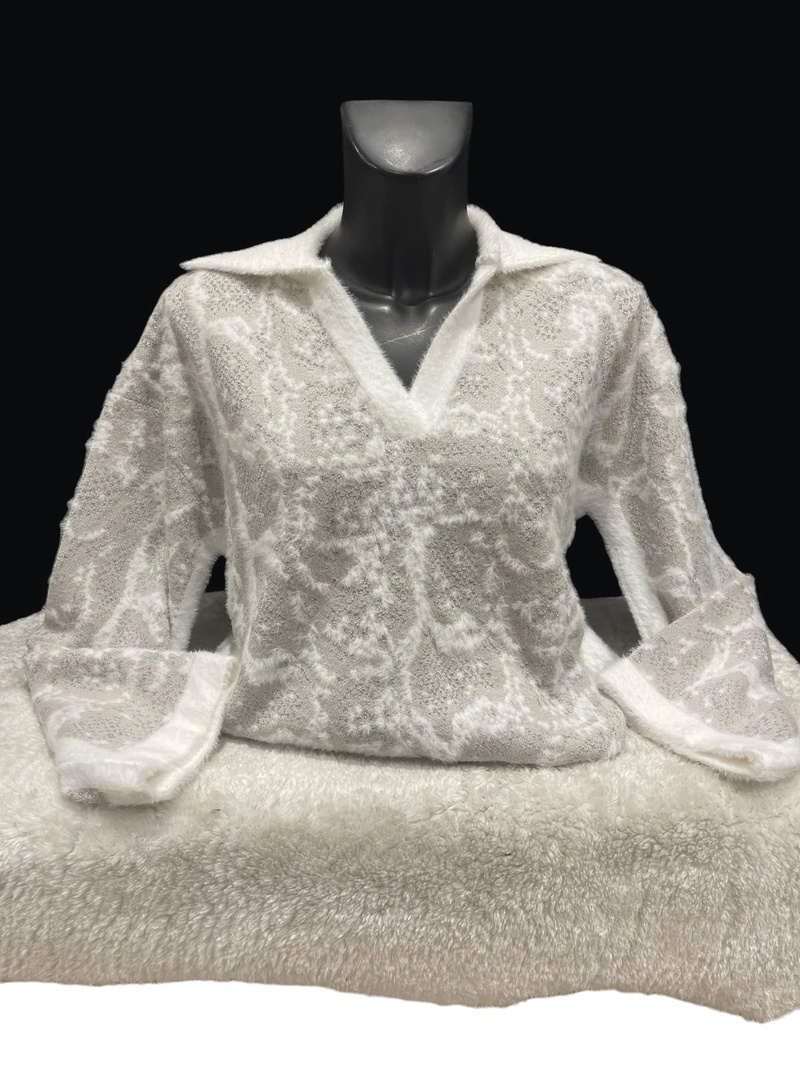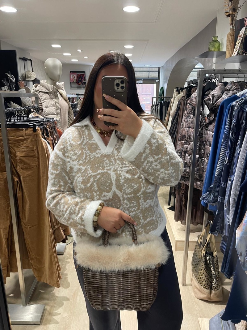 Avec son col V féminin, ses manches légèrement évasées et son motif délicat à reflets discrets, il apporte une touche chic et cocooning à vos tenues du quotidien. Facile à associer, il se porte aussi bien avec un pantalon élégant qu’avec un jean casual.