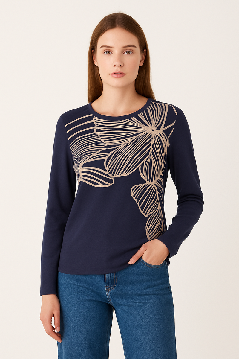 Contraste raffiné entre le bleu marine profond et le motif feuillage beige oversize.