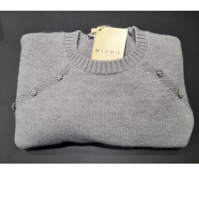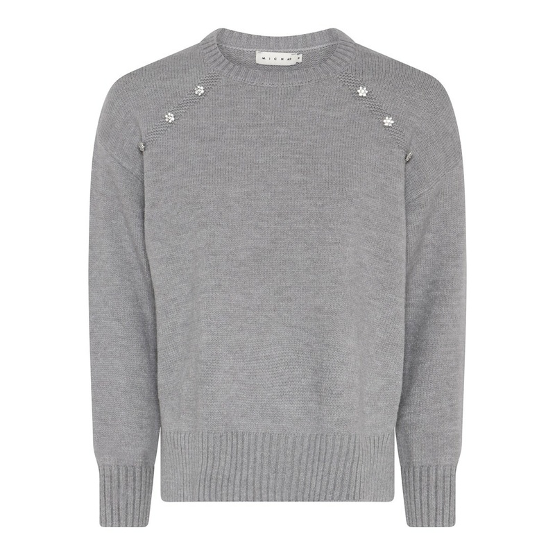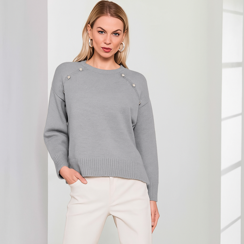 Pull gris femme en maille chaude avec bijoux strass décoratifs aux épaules