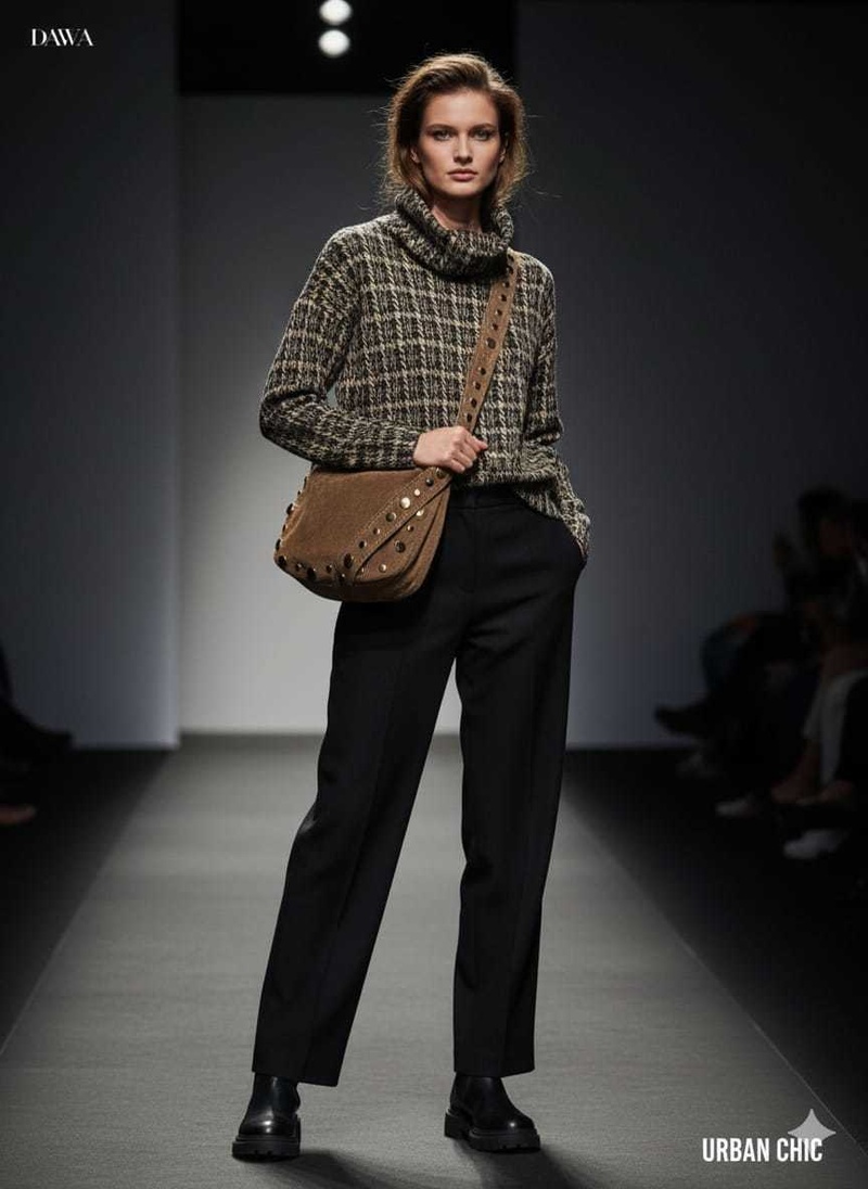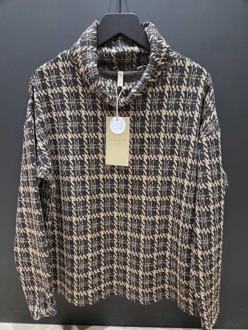Ce joli haut est doté d’un col roulé et d’un imprimé pied-de-poule audacieux noir et beige
