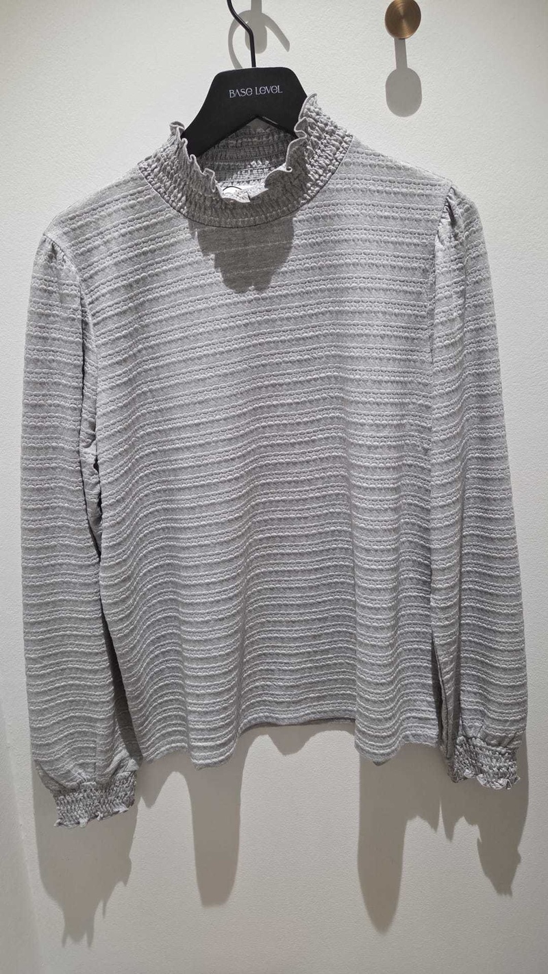 Son col montant à la finition légèrement volantée et froncée encadre délicatement le visage tout en offrant une protection contre le froid. Les manches longues sont magnifiquement travaillées : resserrées et froncées au poignet, elles créent un joli volume subtil et féminin.