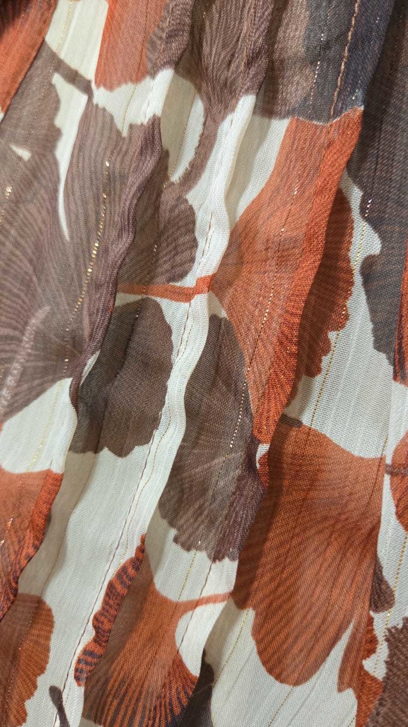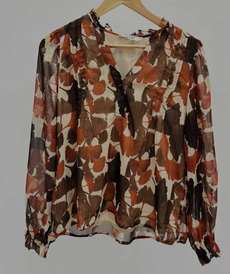 Le motif met à l'honneur les feuilles emblématiques du Gingko Biloba, se déclinant dans une palette riche d'ocre brûlé, de marron chocolat et d'écru. Ce qui rend cette blouse unique, c'est son subtil liseré doré métallisé délicatement tissé dans le tissu (ou imprimé selon le modèle), qui capte la lumière et ajoute une brillance discrète et luxueuse à l'ensemble du motif.