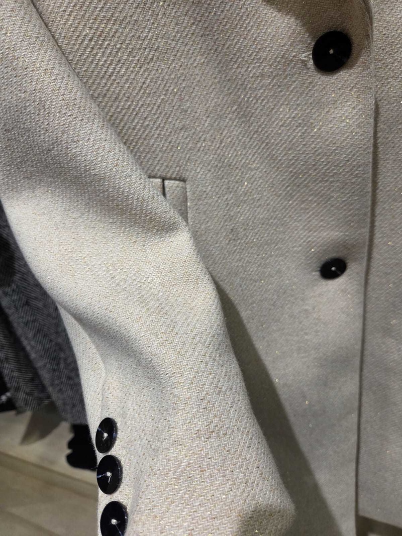 Le Tissu et la Couleur : Ce manteau est confectionné dans un tissu de qualité présentant un motif de chevrons très chic. Sa couleur de base est un beige clair sophistiqué, agrémenté de fils scintillants dorés ou argentés subtilement tissés dans la matière, lui conférant un éclat discret et luxueux à chaque mouvement.