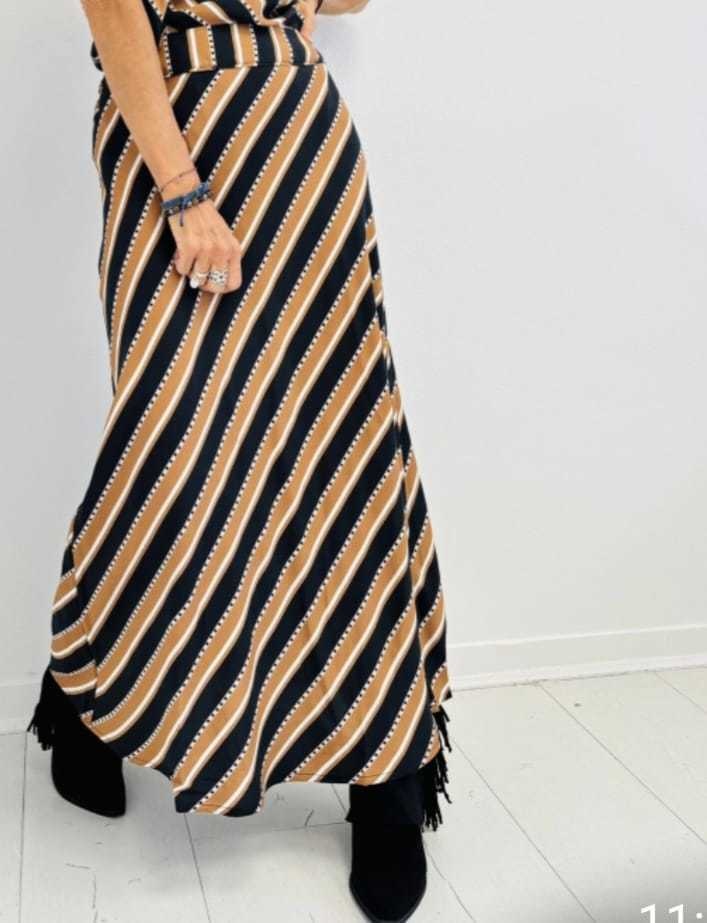 Cette jupe longue An’Ge séduit avec son imprimé graphique tendance et sa coupe fluide qui apporte du mouvement à chaque pas.