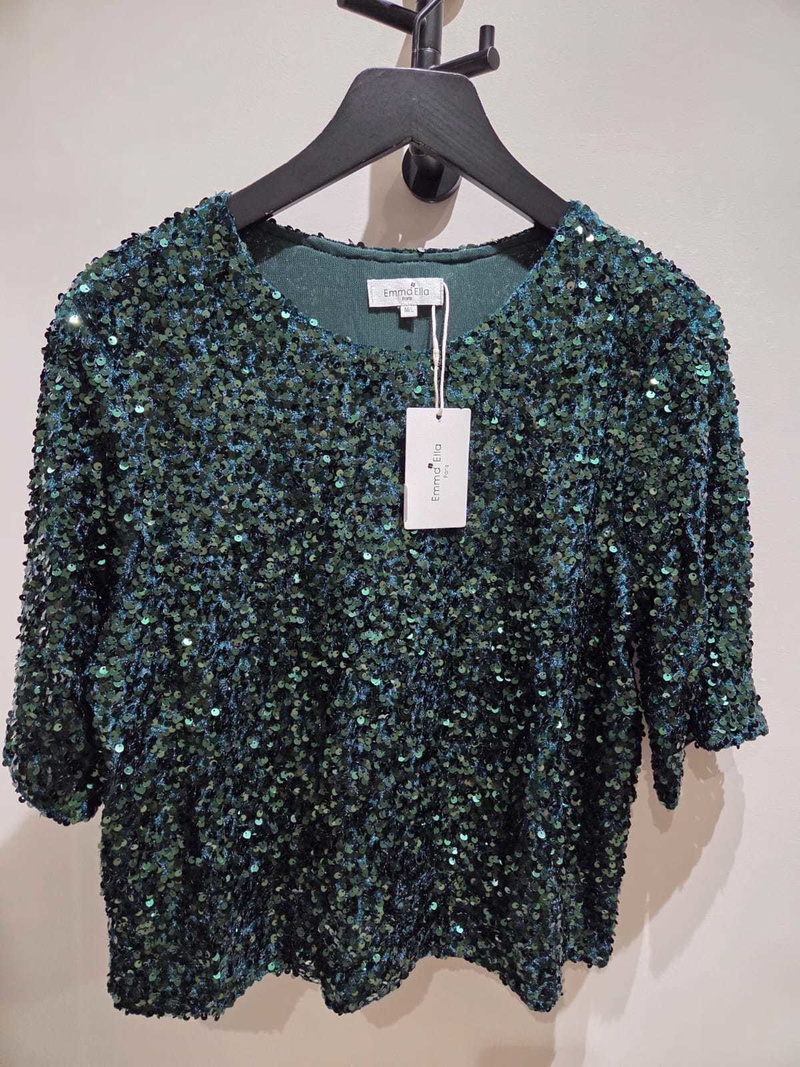 Ce top manches courtes est un véritable bijou : entièrement recouvert de sequins, il brille de mille feux et attire instantanément le regard.