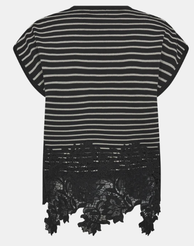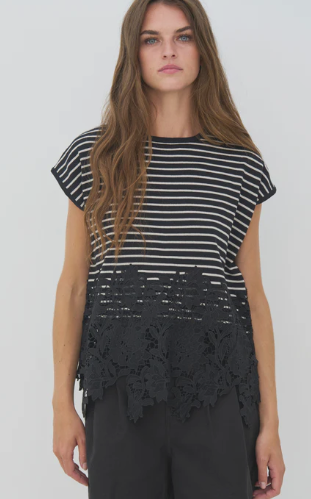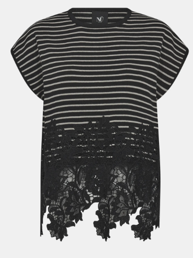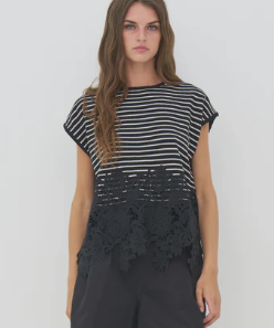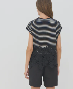 Ce haut se distingue par sa matière douce et confortable, associée à de jolies finitions en dentelle délicate sur le bas, qui créent un contraste subtil et très tendance. Les rayures fines ajoutent du caractère tout en restant faciles à associer à vos basiques préférés.