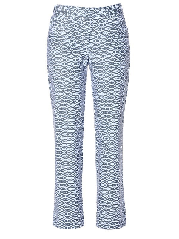 Le tissu présente un motif de losange bleu et blanc créant un effet visuel frais et moderne