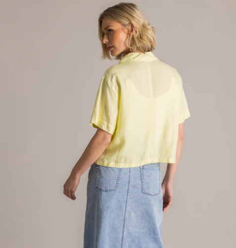 Son coloris jaune pastel lumineux illumine instantanément le teint et apporte de la fraîcheur à la silhouette. Sa coupe fluide et confortable sublime toutes les morphologies avec élégance, tandis que ses manches courtes et sa matière respirante en font une pièce parfaite pour la belle saison.